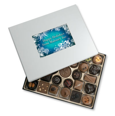 Create a lasting impression with this personalized gift. Your logo, photo or custom message atop our 30-piece Box of Dreams. Just upload a photo or send a message and we’ll print it on a seasonally-themed background.